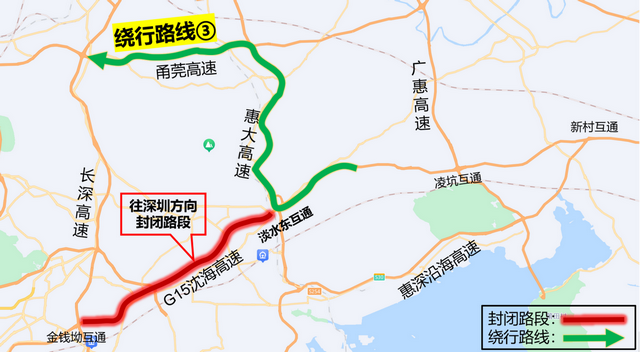 繞行路線③:由淡水東互通,轉(zhuǎn)惠大高速、甬莞高速往深圳方向(見(jiàn)圖3)。