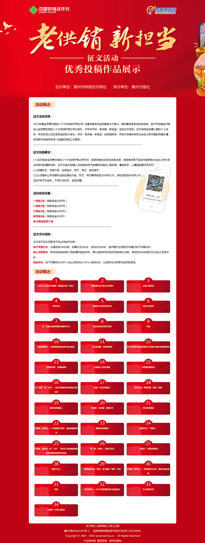 根據(jù)征文要求,要結(jié)合全面貫徹黨的二十大精神開(kāi)局之年特點(diǎn),反映在黨的領(lǐng)導(dǎo)下,供銷合作事業(yè)所取得的矚目成就,回顧供銷社的歷史點(diǎn)滴,征文內(nèi)容為投稿人與供銷系統(tǒng)產(chǎn)生情感共鳴的心路歷程、情感故事、心情隨筆等文字素材,文體以散文、傳記、詩(shī)歌為主。經(jīng)評(píng)委精選,部分稿件將進(jìn)行線上展示收集點(diǎn)贊,并綜合評(píng)委得分及點(diǎn)贊數(shù)評(píng)出作品排名。活動(dòng)主辦方邀請(qǐng)廣大讀者掃碼進(jìn)入點(diǎn)贊頁(yè)面,點(diǎn)贊喜愛(ài)的作品。