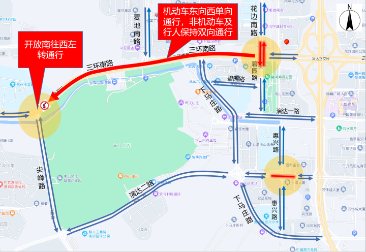 據(jù)了解,惠州市交通運輸局正組織南山快速路工程建設(shè)施工,根據(jù)施工需要,近期將調(diào)整圍蔽三環(huán)南路等部分車道進行施工作業(yè)。為確保施工期間道路交通安全、暢通、有序,惠州市公安局交警支隊根據(jù)《中華人民共和國道路交通安全法》等有關(guān)法律法規(guī),對三環(huán)南路及其周邊道路實施第二階段臨時交通組織。