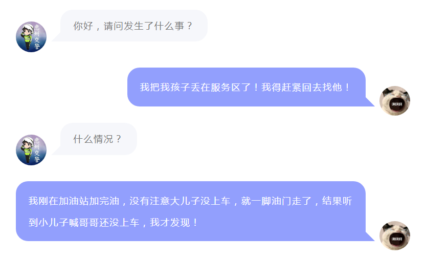 經(jīng)核實,該男孩確為被“丟”的大兒子,其在母親去交費時自己下車上洗手間了,待出來時就發(fā)現(xiàn)車輛已經(jīng)不在了。民警了解完情況后,馬上帶著男孩來到服務(wù)區(qū)出口處與其母親會合。