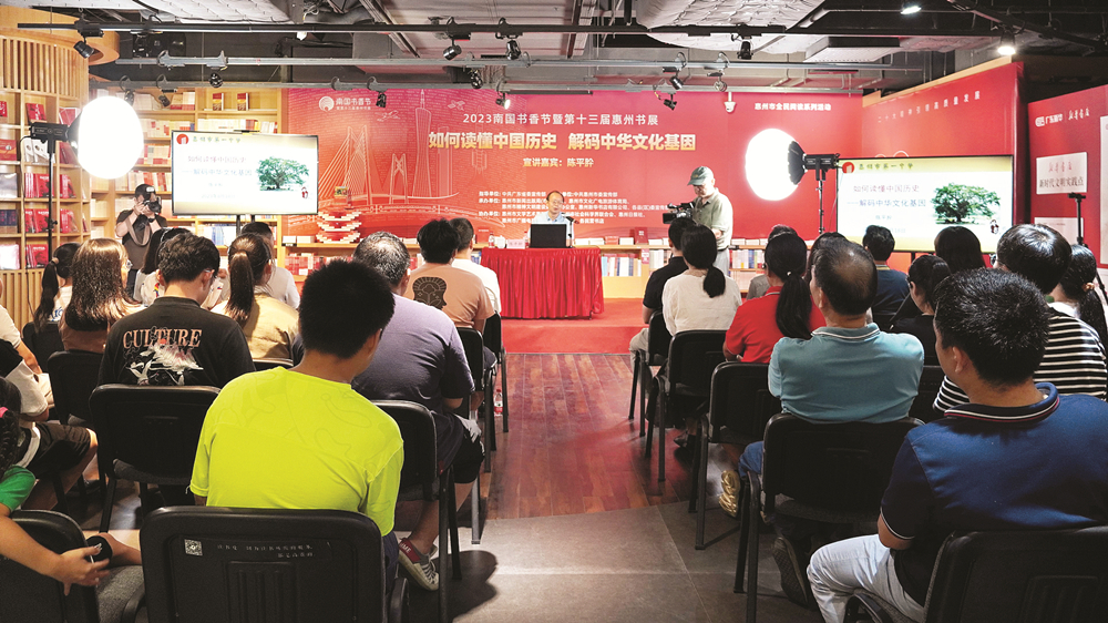 惠州日?qǐng)?bào)訊 (記者涂堅(jiān))8月18日晚,2023南國(guó)書(shū)香節(jié)暨第十三屆惠州書(shū)展在主會(huì)場(chǎng)惠州新華文化廣場(chǎng)舉行“如何讀懂中國(guó)歷史”中華傳統(tǒng)文化推廣活動(dòng),邀請(qǐng)惠州市第一中學(xué)校長(zhǎng)、高級(jí)教師、歷史學(xué)科帶頭人陳平肸為讀者作主題為“如何讀懂中國(guó)歷史 解碼中華文化基因”的分享。