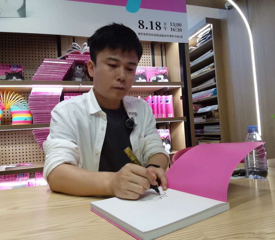 見面會一開場,白茶就稱贊惠州的美食,拉近與惠州讀者的距離,“鹽焗雞特別好吃,聽說還有梅菜扣肉,下次一定要嘗一嘗。”在分享環(huán)節(jié),白茶介紹,《喜干》系列作品中分享的都是他個人生活中的感悟,用家庭情景劇式的小幽默,給予讀者暖心和治愈,F場,白茶也分享了他養(yǎng)寵物的心得,并寄語養(yǎng)寵物或想養(yǎng)寵物的讀者,“與寵物相處要有包容心和責任心。”