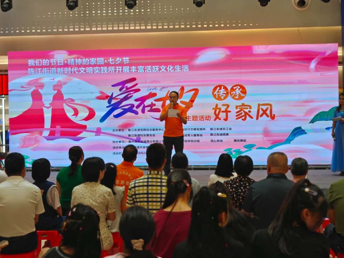 七夕今宵看碧霄,牽牛織女渡河橋。家家乞巧望秋月,穿盡紅絲幾萬條。七夕是我國傳統(tǒng)節(jié)日中最具浪漫色彩的節(jié)日。8月22日,在這個浪漫的節(jié)日里,仲愷高新區(qū)陳江街道黨群綜合服務(wù)中心、新時代文明實踐所、婦聯(lián)、退役軍人服務(wù)站、團委、總工會等單位聯(lián)合開展“愛在七夕節(jié)·傳承好家風”主題活動;顒蝇F(xiàn)場邀請了轄區(qū)不同年齡段的模范夫妻代表,通過“穿針引線”“朦朧的浪漫”“牛郎織女”等互動環(huán)節(jié),回顧愛的歷程,共度傳統(tǒng)佳節(jié)。