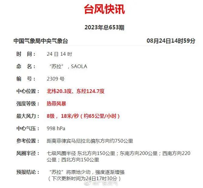 原位于菲律賓以東的西北太平洋洋面上的熱帶低壓已于24日14時加強為今年第9號臺風(fēng)“蘇拉”(熱帶風(fēng)暴級,英文名:Saola,來源:越南,意義:一種動物),其中心位于廣州市東南方向約1200公里,也就是北緯20.3度、東經(jīng)124.7度,中心附近最大風(fēng)力8級(18米/秒),中心最低氣壓998百帕。預(yù)計,24-29日“蘇拉”路徑以原地回旋為主,強度逐漸加強。