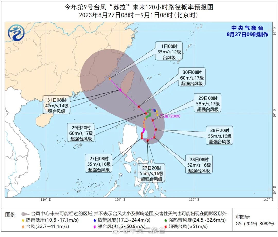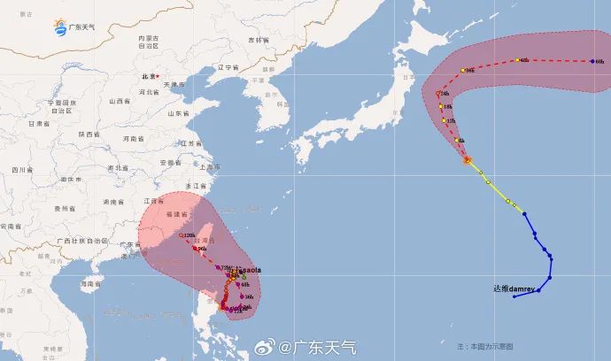 中央氣象臺預(yù)計,“蘇拉”將先在菲律賓呂宋島東北部洋面徘徊,29日開始向西北方向移動,向臺灣島南部到巴士海峽一帶海域靠近,強度維持或有所減弱,將于30日夜間掠過臺灣島南部,并將于31日白天進(jìn)入臺灣海峽。