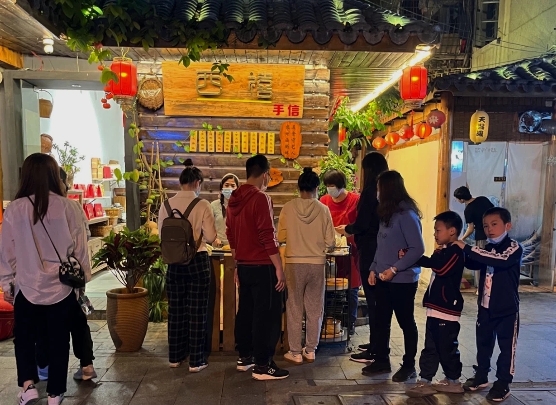 隨著祝屋巷文旅街區(qū)逐漸興旺,陳小麗的烘焙店紅火起來,成為一家網(wǎng)紅店,顧客在品嘗、購買產(chǎn)品的同時,不忘與熱情的陳小麗合影留念。