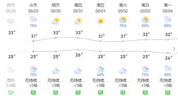 周三至周五,多云到晴天,26~35℃;