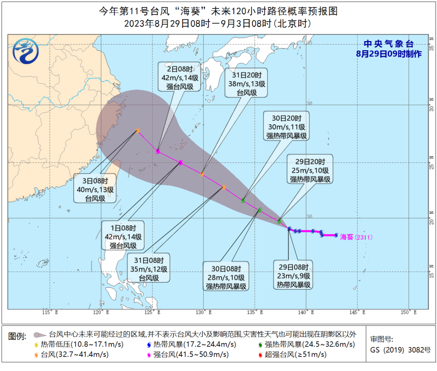 由于目前海溫條件較好,普遍都在29℃以上,加上未來(lái)高低層風(fēng)切變不大,因此考慮它的強(qiáng)度還會(huì)繼續(xù)加強(qiáng),最強(qiáng)可達(dá)超強(qiáng)臺(tái)風(fēng)級(jí)。