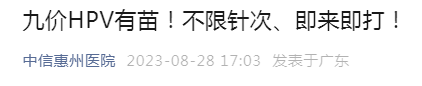 惠州一地醫(yī)院發(fā)文:九價HPV有苗!不限針次、即來即打!