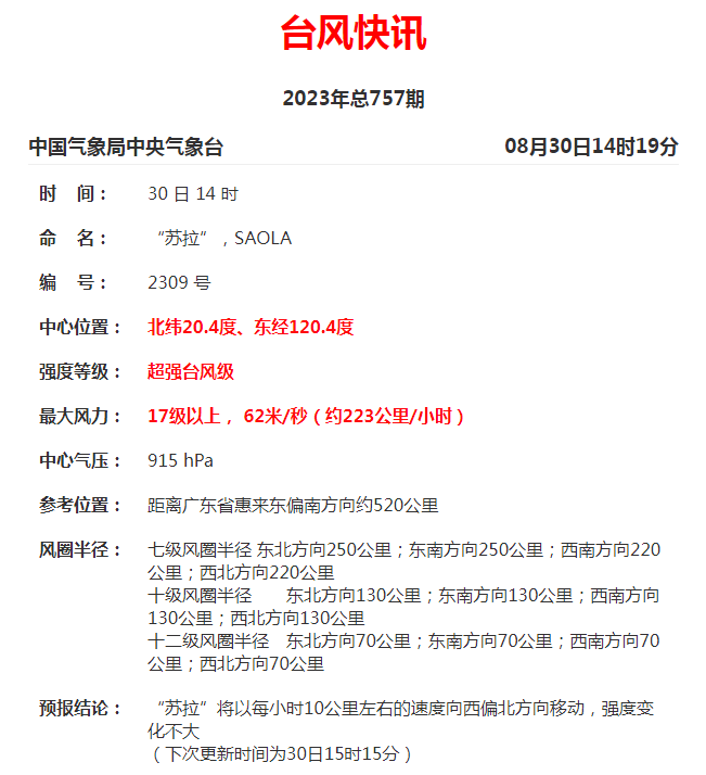 據(jù)廣東天氣,8月30日11時,今年第9號臺風(fēng)“蘇拉”(超強臺風(fēng)級)中心位于北緯20點2度,東經(jīng)120點8度,也就是在距離汕尾東南方向約570公里的巴士海峽海面上,中心附近最大風(fēng)力17級以上,達到62米每秒的風(fēng)速,中心最低氣壓915百帕,八級大風(fēng)范圍半徑約190公里。