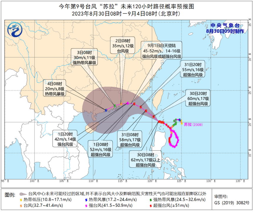 預(yù)計,“蘇拉”將以每小時10-15公里的速度向西北方向移動,于30日夜間或31日凌晨移入南海東北部海面,逐漸向廣東東部到福建南部一帶沿?拷,有可能于9月1日白天在上述沿海登陸(強臺風(fēng)級或超強臺風(fēng)級,45-52米/秒,14-16級),也有可能在廣東東部近岸海面向西偏南方向移動。
