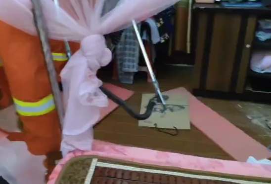 現(xiàn)場(chǎng)消防救援人員穿戴好防護(hù)裝備,根據(jù)居民的指引來(lái)到房間的衣柜前,發(fā)現(xiàn)一條長(zhǎng)約1.3米的劇毒眼鏡蛇正纏繞在衣物上。