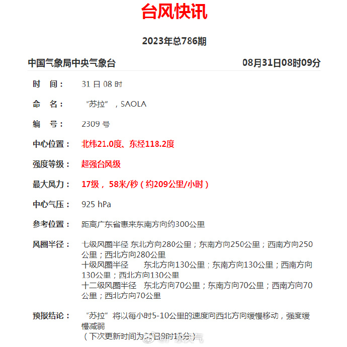 【“蘇拉”將于1日下午到夜間上岸】今晨8時,超強臺風(fēng)“蘇拉”繼續(xù)維持在17級,