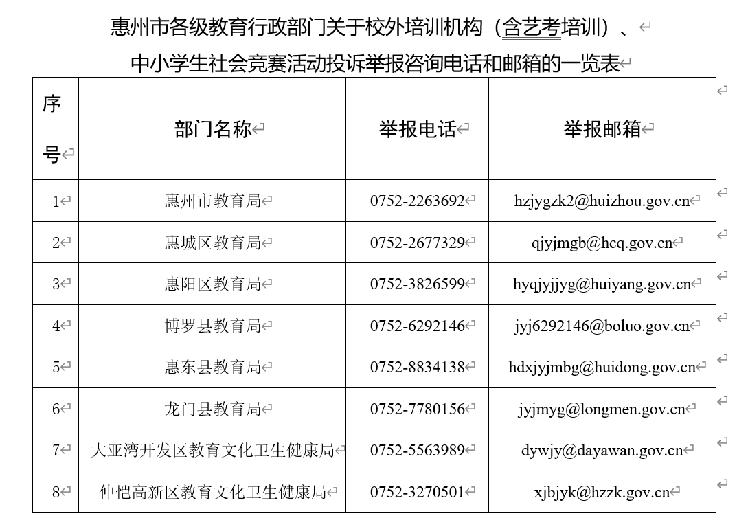 8月29日,惠州市教育局發(fā)布《關(guān)于公布惠州市中小學(xué)生校外培訓(xùn)(含藝考培訓(xùn))、中小學(xué)生社會競賽活動投訴舉報咨詢電話和郵箱的公告》,凡是涉及校外培訓(xùn)機(jī)構(gòu)(含藝考培訓(xùn))資質(zhì)、課程、師資、招生、收費、侵害未成年人身心健康等方面問題,以及面向中小學(xué)生的各類社會競賽活動問題都可以舉報。