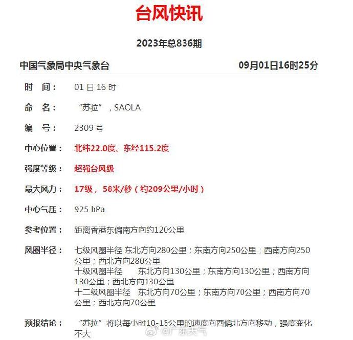 今年第9號臺風(fēng)“蘇拉”(超強臺風(fēng)級)的中心今天(9月1日)下午5點鐘位于香港東偏南方大約110公里的南海東北部海面上,就是北緯22.0度、東經(jīng)115.1度,中心附近最大風(fēng)力有17級(58米秒),中心最低氣壓為925百帕,七級風(fēng)圈半徑250-280公里,十級風(fēng)圈半徑130公里,十二級風(fēng)圈半徑70公里。
