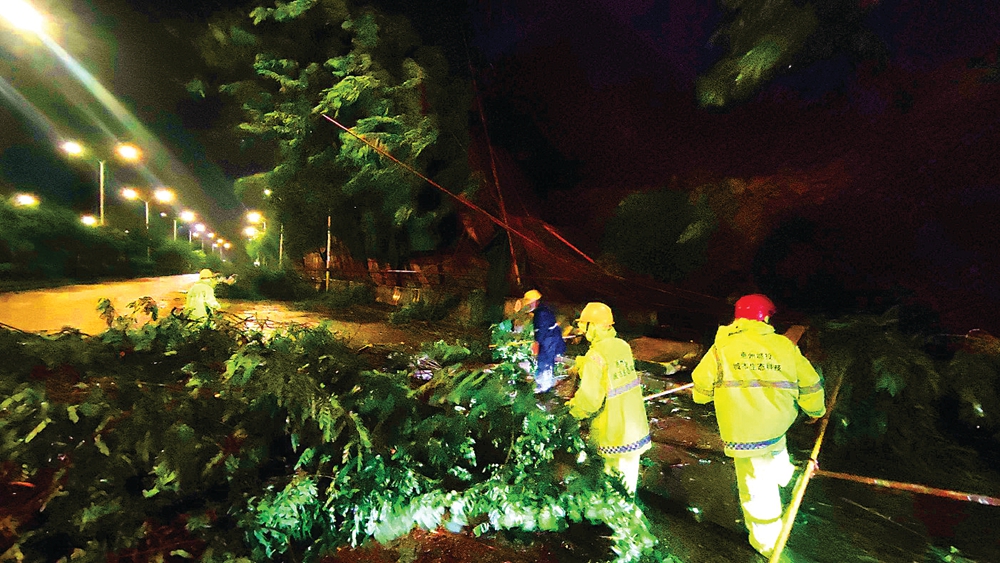 9月1日傍晚,大亞灣區(qū)澳頭街道巖前村大樹被風(fēng)吹倒,街道辦和村委會立即組織人員緊急處置;葜萑請笥浾咴o妍 通訊員唐露 攝