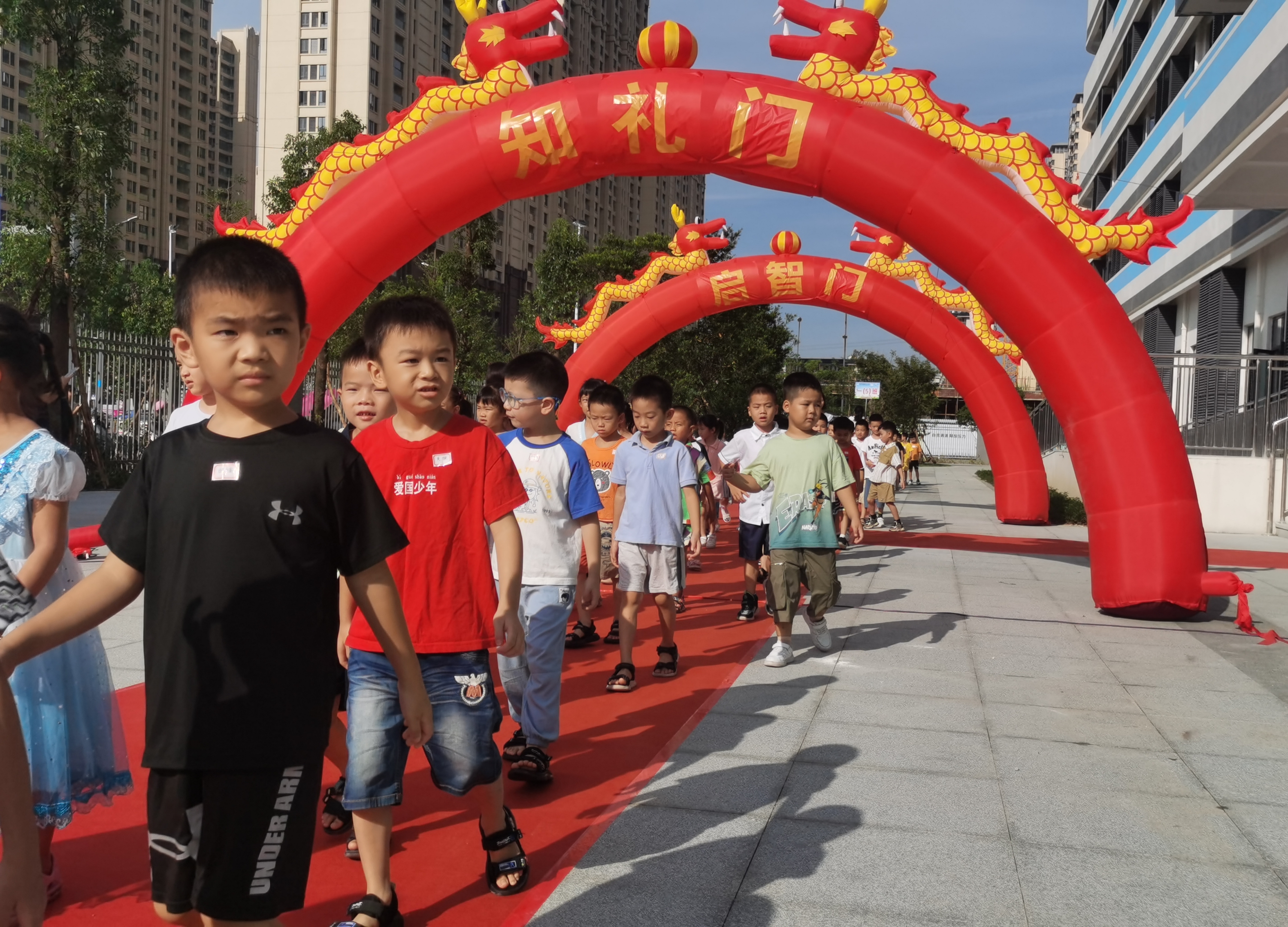 博羅三小在開(kāi)學(xué)當(dāng)天設(shè)置紅毯歡迎新生入校。 惠州日?qǐng)?bào)記者盧泓宇 朱麗婷 攝