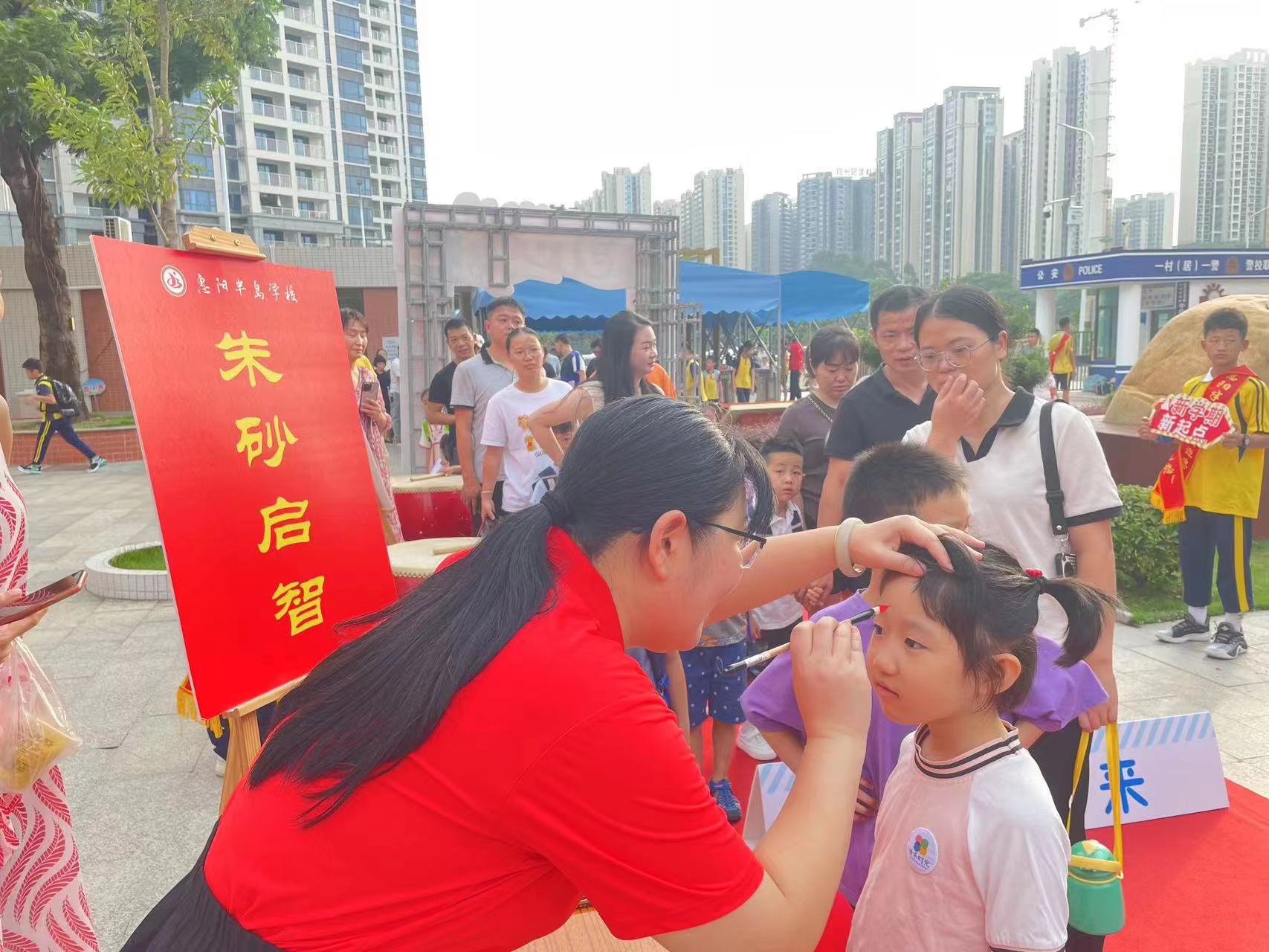 9月4日上午,惠陽(yáng)半島學(xué)校舉行了以“加油開(kāi)學(xué)季,筑夢(mèng)向未來(lái)”為主題的新生入學(xué)儀式。學(xué)校為孩子們?cè)O(shè)置了“向陽(yáng)生長(zhǎng)”“筑夢(mèng)未來(lái)”“心向未來(lái)”字樣的跨欄,每個(gè)跨欄以及水果代表著學(xué)校對(duì)孩子們的美好祝愿,希望他們光芒初綻,一步一個(gè)腳印,奔赴燦爛前程?鐧谥缶褪菗艄拿髦,每一聲鼓聲都孕育著一個(gè)嶄新的希望,這一儀式飽含著惠陽(yáng)半島學(xué)校對(duì)孩子們的殷切期望,望其目明耳聰、茅塞頓開(kāi)、創(chuàng)業(yè)建功。額點(diǎn)朱砂,啟蒙開(kāi)智。在朱砂點(diǎn)痣環(huán)節(jié),老師們?cè)诿恳粋(gè)孩子的眉心點(diǎn)上一顆朱砂痣,寓意打開(kāi)了稚童們的求學(xué)之門、鋪砌了人生的行走之路。學(xué)校特意設(shè)置了新生拍照打卡點(diǎn),孩子們有序地打卡拍照,留下一張張開(kāi)心的笑臉,記錄下進(jìn)入小學(xué)的美好瞬間。