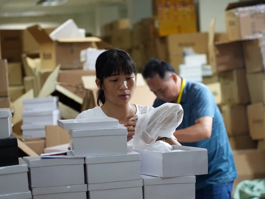 女鞋倉庫內(nèi),多名工作人員正忙著仔細(xì)檢查一雙雙女鞋,緊接著,工作人員操控電腦進(jìn)行發(fā)貨。很快,這些女鞋就將搭乘跨境電商的“列車”奔赴全球各地。
