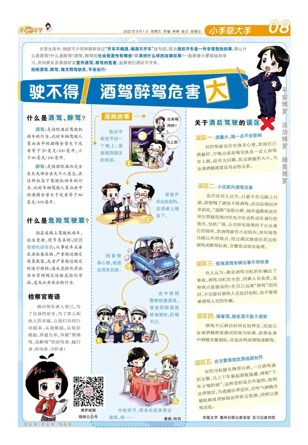 惠州檢察機(jī)關(guān)積極開展“小手拉大手”系列活動,通過定制普法法治報、送法進(jìn)校園、致家長的一封信、簽訂拒絕酒后駕駛承諾書等方式,將預(yù)防酒醉駕宣傳工作從社會延伸至學(xué)校反饋到家庭,充分發(fā)揮孩子在家庭日常生活中拒絕酒駕醉駕宣傳員和監(jiān)督員的作用,實(shí)現(xiàn)小家庭帶動大社會,營造良好的社會氛圍。博羅縣檢察院于秋季開學(xué)推出定制的“法治報”,報刊內(nèi)容包含整版預(yù)防酒醉駕宣傳內(nèi)容,共計贈閱12.6萬余份,覆蓋博羅縣所有小學(xué)生。