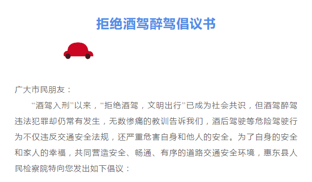 惠東縣檢察院通過微信公眾號向社會公眾發(fā)出的致家長的一封信《小手拉大手,拒絕酒駕醉駕一起走》,由該院未檢部門聯(lián)合教育部門向全縣各學(xué)校進(jìn)行轉(zhuǎn)發(fā)及線上簽閱。