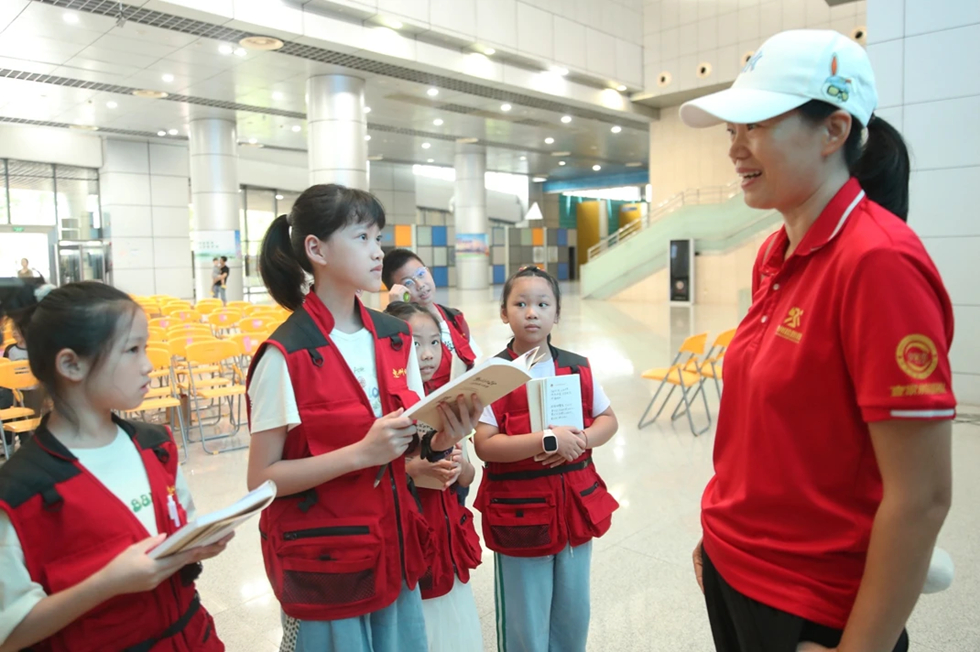 科技館講解員帶領(lǐng)撿跑志愿者代表參觀科技館 。