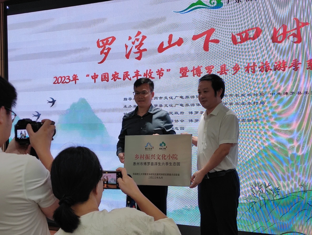 全省首個鄉(xiāng)村振興文化小院落戶惠州,吳志才(右)為博羅浮生六季生態(tài)園授牌。