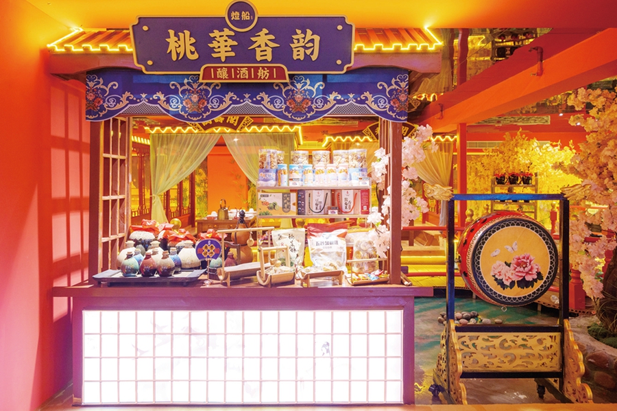 酒過三巡,酒宴將息,食客紛紛離席,有的潛入流光溢彩的亭臺(tái)樓閣之中,有的穿行于鱗次櫛比的攤位之間,與唐朝“名家”及盛唐文化一一邂逅,讓“眼耳鼻舌身意”六感都沉浸其中,幻化出一個(gè)淵然而深妙的感官意境。驚鴻一瞥,皆是詩(shī)意的盛唐場(chǎng)景。