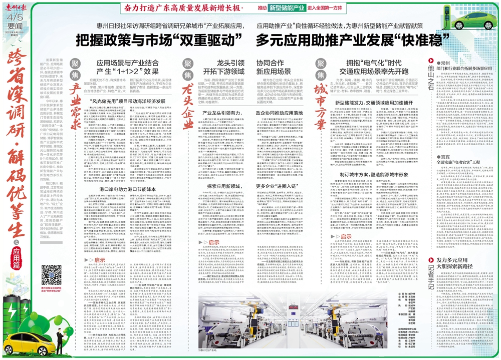 ——緊盯龍頭企業(yè),推動新應用場景從點向面落地。采訪調研組建議,惠州要建立與龍頭企業(yè)定期溝通機制,及時了解本土龍頭企業(yè)基于市場發(fā)展的業(yè)務調整以及創(chuàng)新進展,精準服務企業(yè)開拓新應用場景;遴選布局企業(yè)發(fā)布的創(chuàng)新成果,結合惠州需求及時對接引進項目落地,形成生產→應用→新的產業(yè)鏈的良性循環(huán)生態(tài)圈,推動更多儲能應用場景在惠州落地。