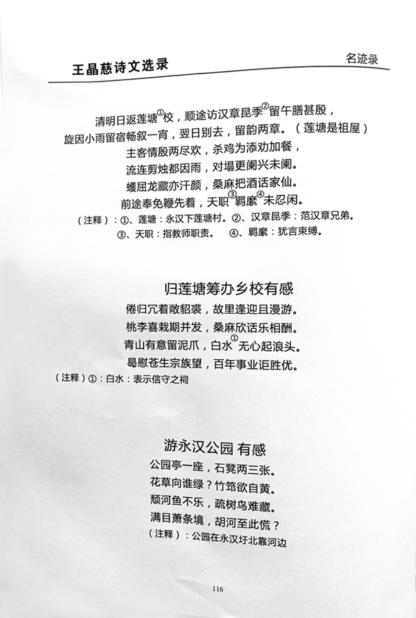 多年來,在永漢蓮塘,很多年輕一代“常聽老人們提到文人王晶慈的名字”。王晶慈的事跡,經(jīng)過后人收集、整理,先后見載于《龍門文史》(1986年)、《龍門縣志》(1995年)。后人將王偉卿、王晶慈、王一洲三代人的詩歌編為《怡廬詩集》,留下一份珍貴的文獻(xiàn)資料!洱堥T縣麻榨約坑永漢蓮塘云鸞裔王氏族譜》(2020年)亦收錄王晶慈詩作若干,這些詩篇傳承的不僅是文化,更是一種民族精神。