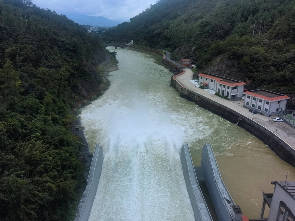 白盆珠水庫開閘泄洪現(xiàn)場(chǎng)。
