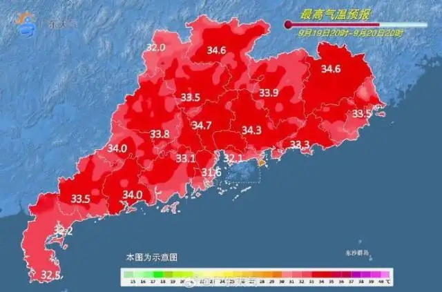 18日到19日,廣東省大部多云到晴天,午后有分散(雷)陣雨。最高氣溫:南部市縣30℃~32℃,其余大部分市縣33℃~35℃。