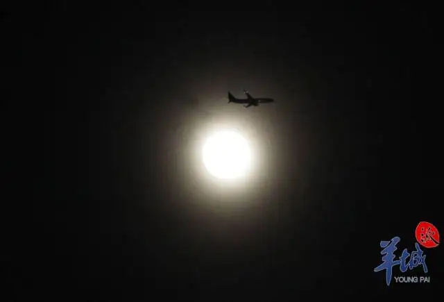 資料圖:月亮透過朦朧云層出現(xiàn)在廣州夜空,一架民航客機恰好經(jīng)過。羊城晚報全媒體記者 梁懌韜 攝