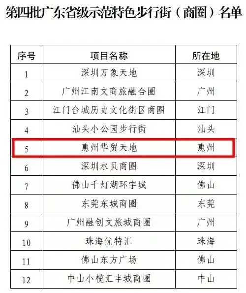 惠州日?qǐng)?bào)訊 (記者劉煒煒 通訊員劉煒)廣東省商務(wù)廳近日印發(fā)了《關(guān)于公布第四批廣東省級(jí)示范特色步行街(商圈)名單的通知》,全省共有來(lái)自廣州、深圳、惠州等地的12個(gè)步行街(商圈)上榜,其中惠州華貿(mào)天地榜上有名。
