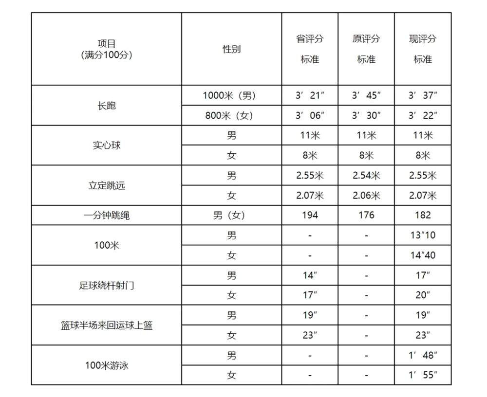 說(shuō)明中稱,我市現(xiàn)行中考體育政策已實(shí)行15年,與省和其他地市制訂的標(biāo)準(zhǔn)比較,科目評(píng)分標(biāo)準(zhǔn)較低。為促進(jìn)學(xué)生體質(zhì)健康發(fā)展,體現(xiàn)與考試分?jǐn)?shù)(滿分64分)相符,根據(jù)《廣東省中考體育項(xiàng)目規(guī)則及評(píng)分標(biāo)準(zhǔn)》和參照其他地市標(biāo)準(zhǔn),經(jīng)反復(fù)研究,對(duì)中考體育項(xiàng)目評(píng)分標(biāo)準(zhǔn)進(jìn)行小幅調(diào)高(調(diào)高后分值仍低于或持平省標(biāo)準(zhǔn)),調(diào)整后其合格性考試的性質(zhì)沒(méi)有改變。