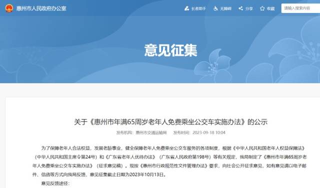 惠州關(guān)于《惠州市年滿65周歲老年人免費(fèi)乘坐公交車實(shí)施辦法》的公示來了。