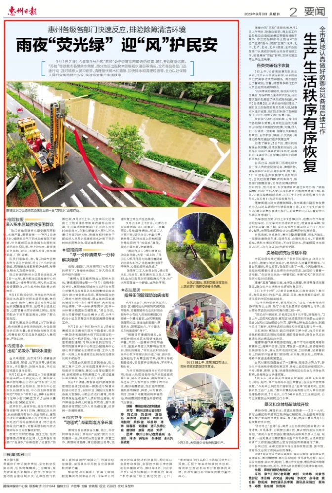 《惠州日報(bào)》9月3日刊發(fā)的通訊報(bào)道《雨夜“熒光綠” 迎“風(fēng)”護(hù)民安》。