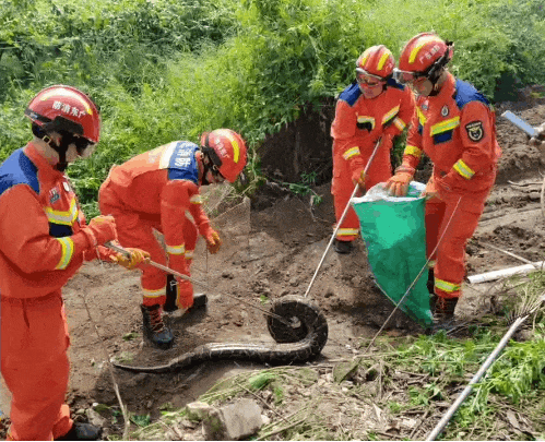 到達(dá)現(xiàn)場后,指揮員立即對現(xiàn)場開展偵查,發(fā)現(xiàn)一條蟒蛇正藏在雜草堆下。