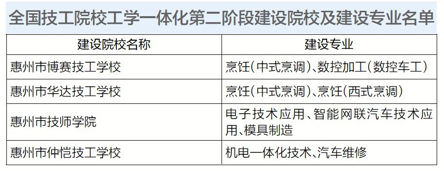 近日,人力資源社會保障部辦公廳發(fā)布《關于公布全國技工院校工學一體化第二階段建設院校及建設專業(yè)名單的通知》,其中惠州市技師學院、惠州市華達技工學校、惠州市博賽技工學校、惠州市仲愷技工學校共4所學校進入全國技工院校工學一體化第二階段建設院校名單。