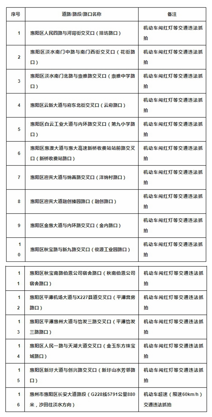 為加強惠陽區(qū)道路交通管理,規(guī)范道路交通秩序,維護道路交通安全,預(yù)防和減少道路交通事故,惠陽區(qū)交警部門準備啟用(重啟)轄區(qū)16個點位交通技術(shù)監(jiān)控設(shè)備,為保證道路交通管理執(zhí)法規(guī)范、透明、公正,按照《道路交通安全違法行為處理程序規(guī)定》第十六條第二款“固定式交通技術(shù)監(jiān)控設(shè)備設(shè)置地點應(yīng)當(dāng)向社會公布”等有關(guān)規(guī)定,現(xiàn)將上述16處交通技術(shù)監(jiān)控設(shè)備所在位置予以公布,具體如下: