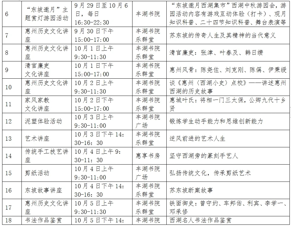 中秋、國(guó)慶即將來(lái)臨,惠州日?qǐng)?bào)記者從惠州西湖景區(qū)管理中心獲悉,西湖景區(qū)在中秋、國(guó)慶節(jié)期間,將舉辦多種形式的活動(dòng),包括黨史宣講、精品研學(xué)課程建設(shè)研討會(huì)、祭孔活動(dòng)、寫(xiě)生作品創(chuàng)作談、中秋詩(shī)會(huì)、賞燈游園活動(dòng)、各類(lèi)講座、剪紙活動(dòng)、古箏演奏等等。歡迎感興趣的市民群眾前往參加。