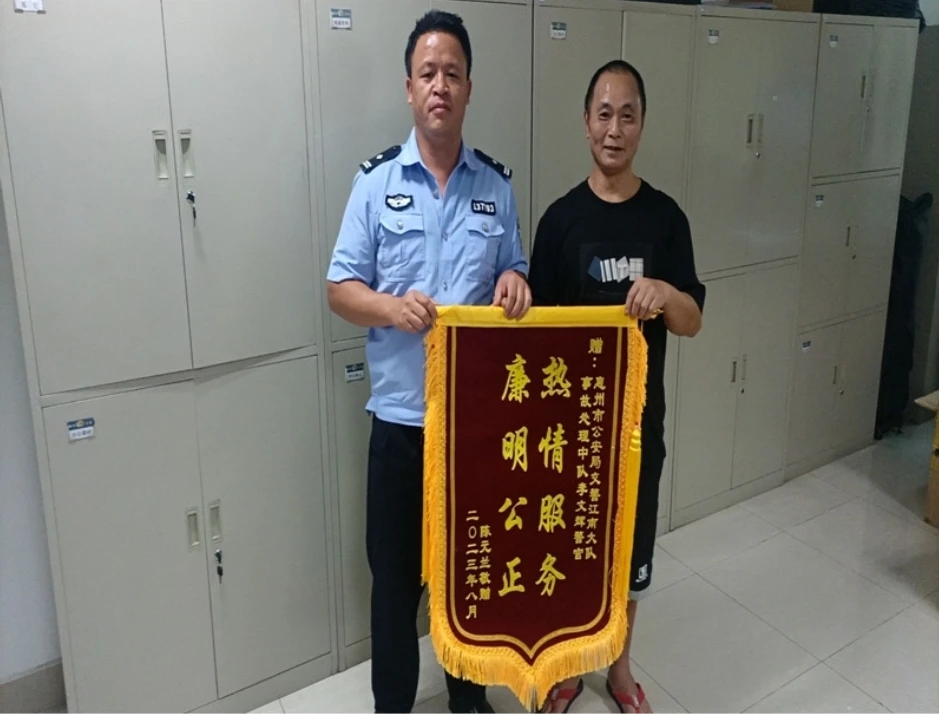 傷者家屬不辭辛苦來到惠州,向民警李文輝送上一面“熱情服務(wù) 廉明公正”錦旗。