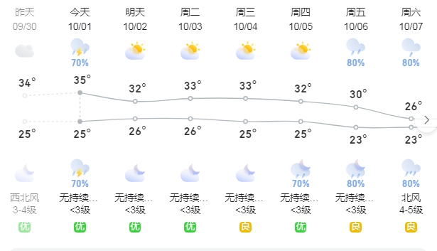 預(yù)計(jì),10月1-2日,晴天到多云,午后有分散(雷)陣雨,氣溫25~35℃;3-4日,晴天到多云,局部有(雷)陣雨,氣溫25~35℃;5日,晴天到多云,有(雷)陣雨,氣溫25~34℃;展望6-7日,多云間陰天,有(雷)陣雨局部大雨或暴雨,氣溫有所下降。