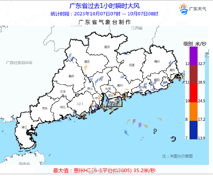 據(jù)@廣東天氣 10月7日9時(shí)消息,從過(guò)去1小時(shí)的瞬時(shí)大風(fēng)圖可見(jiàn),風(fēng)力主要集中在粵東至珠三角沿海一帶,其中惠州錄得最大陣風(fēng)12級(jí)(35.2米/秒),這個(gè)風(fēng)力等級(jí)是可以吹斷樹枝、吹彎路牌的節(jié)奏。
