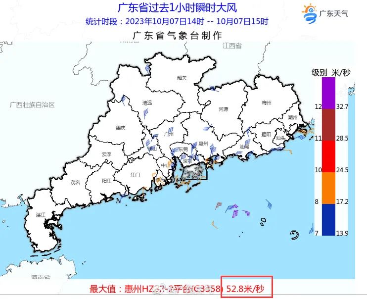 “小犬”西移緩慢,今日15時(shí)距離汕尾偏南方向約190公里,7級風(fēng)圈吹上岸,珠三角至粵東沿海一帶首當(dāng)其沖,其中惠州HZ32-2平臺在今日午后已連續(xù)錄得超過50米/秒的極大風(fēng),15時(shí)更是達(dá)到52.8米/秒,高達(dá)16級。