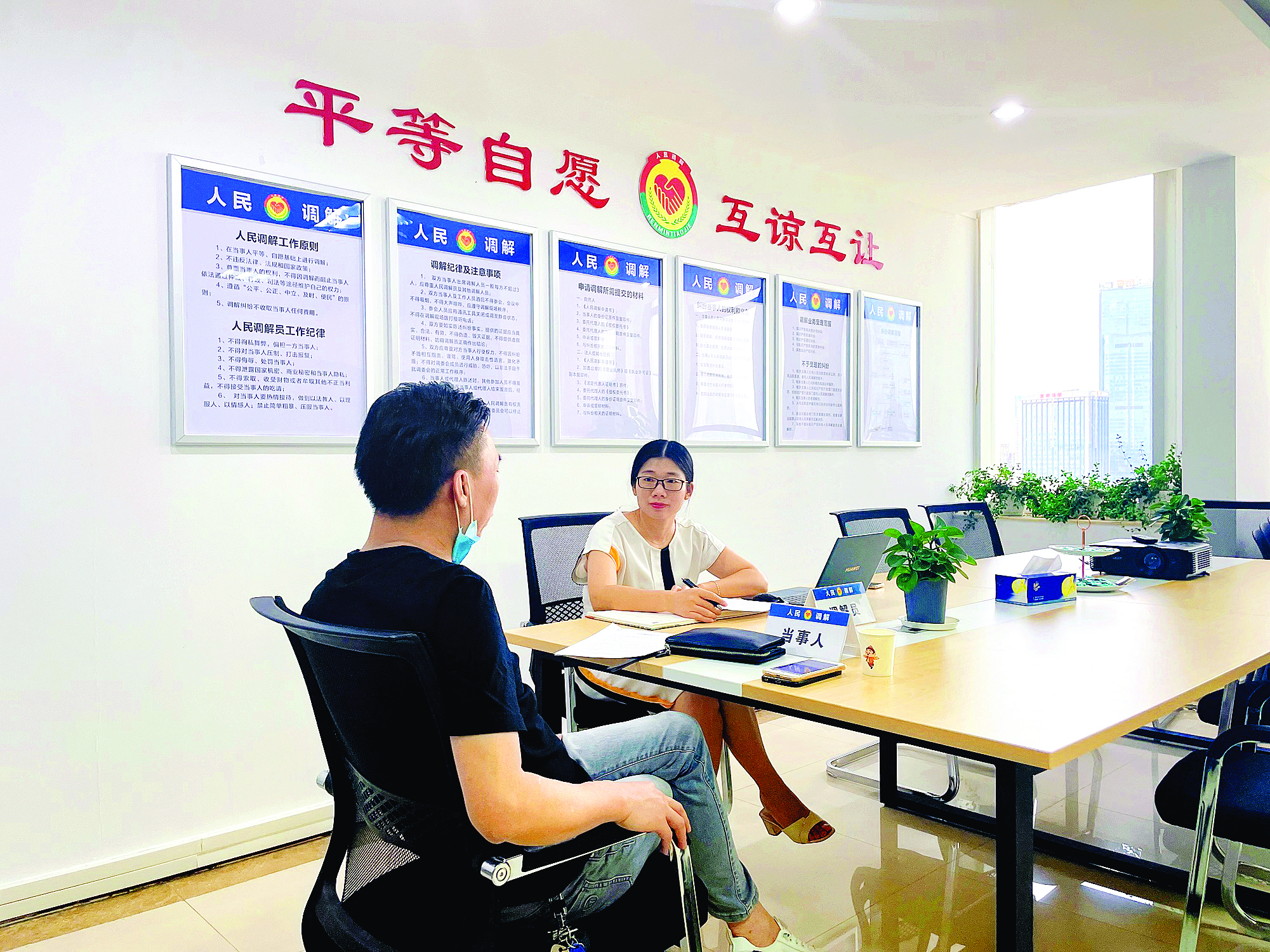 惠州市知識產(chǎn)權(quán)糾紛人民調(diào)解委員會調(diào)解員在進行調(diào)解;葜葜{(diào)委供圖