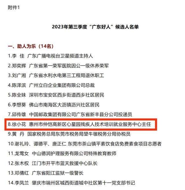 近日,2023年第三季度“廣東好人”候選人公示。在50名候選人中,惠州市仲愷高新區(qū)心星園殘疾人技術(shù)培訓(xùn)就業(yè)服務(wù)中心主任徐小花榜上有名。