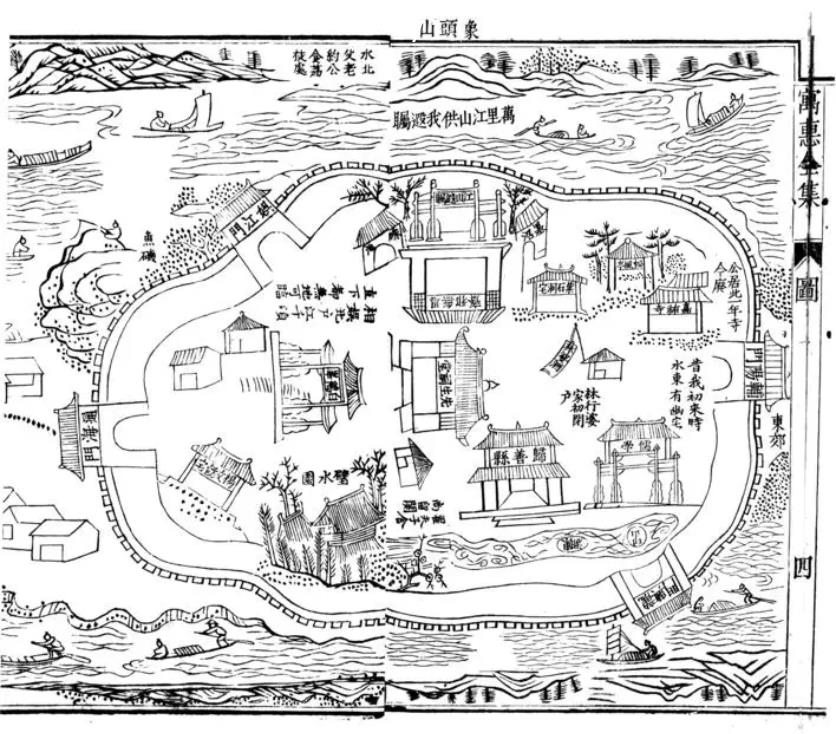 繪制于明崇禎四年(1631)的《惠景全圖》,完整地展示了惠州古代“一街挑兩城”的獨(dú)特格局。在這幅圖里,城開四門、城墻包裹的歸善縣城形似烏龜,在東江與西枝江的環(huán)繞中,被東新浮橋牽引,西向惠州府城游去。