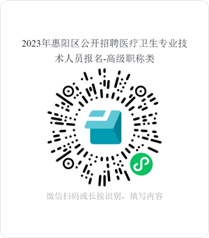 考生掃描二維碼進(jìn)入“2023年惠陽區(qū)公開招聘醫(yī)療衛(wèi)生專業(yè)技術(shù)人員報(bào)名(高級(jí)職稱類)”,按要求認(rèn)真準(zhǔn)確填寫相關(guān)信息和上傳相關(guān)報(bào)名材料。