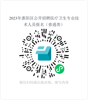 采用微信小程序報(bào)名,不接受現(xiàn)場(chǎng)報(bào)名。考生掃描二維碼進(jìn)入“2023年惠陽區(qū)公開招聘醫(yī)療衛(wèi)生專業(yè)技術(shù)人員報(bào)名(普通類)”,按要求認(rèn)真準(zhǔn)確填寫相關(guān)信息和上傳相關(guān)報(bào)名材料。